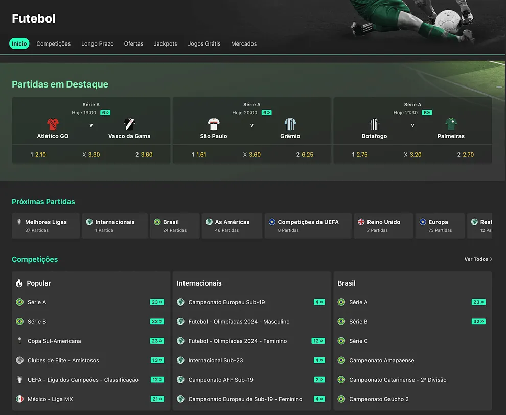 No Brasil, o futebol é uma verdadeira obsessão nacional e, naturalmente, domina o mercado de apostas. De partidas eletrizantes da Série A a grandes competições internacionais como a UEFA Champions League, os apostadores têm inúmeras oportunidades. Alguns dos mercados mais populares são Over/Under Gols, Ambas Marcam (BTTS) e Resultado da Partida (1X2).