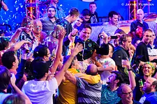 Pouco depois acabaria por ser Hellmuth a ser eliminado. O jogador que tem 13 braceletes, acabou por ficar short e meter todas com A♥7♠ e Michael Tran agarrou de 4♠4♣.