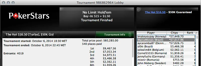 Mateus "pimenta7" Pimenta cravou e juntou mais $13,832 à sua conta do PokerStars.