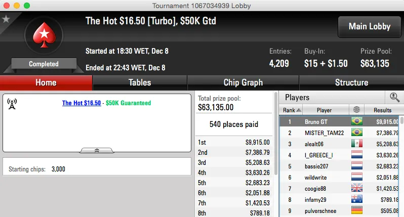 Para além destes resultados de 5 dígitos, tivemos vários de 4, o maior foi a vitória de BrunoGT no The Hot $16,50 ($9,915). O heads-up foi jogado e ganho contra o também brasileiro MISTER_TAM22 ($7,386).