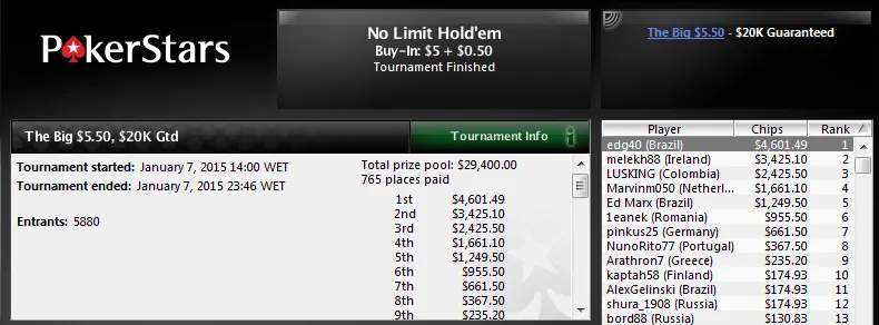 Já no The Big $162 foi a vez de "rafitia" forrar US$7,852 depois de terminar o torneio com 698 participantes na 4ª colocação.