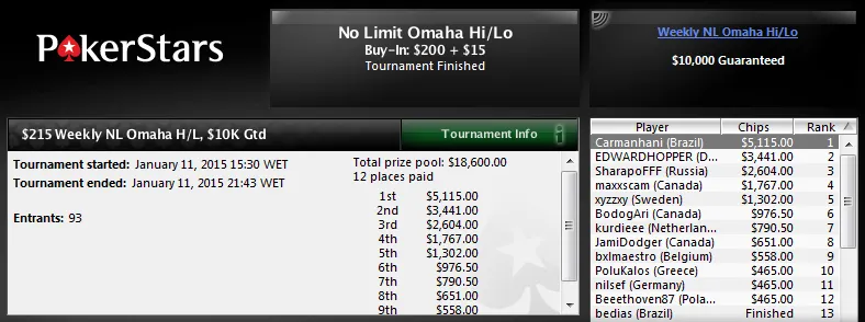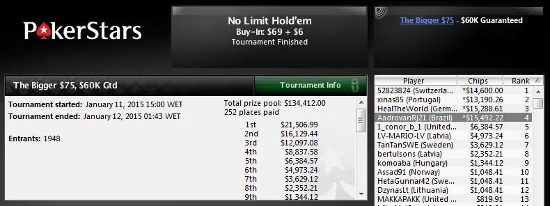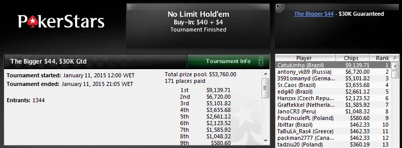 A maior forra veio por Armando "Zareta" Sbrissa que foi vice no $215 Sunday 2nd Chance, torneio que contou com 1,295 participantes. O prize pool chegou aos US$259,000 e só para a sua conta Armando levou US$32,893! O polaco "Siewas" venceu o heads-up e levou US$45,273.
