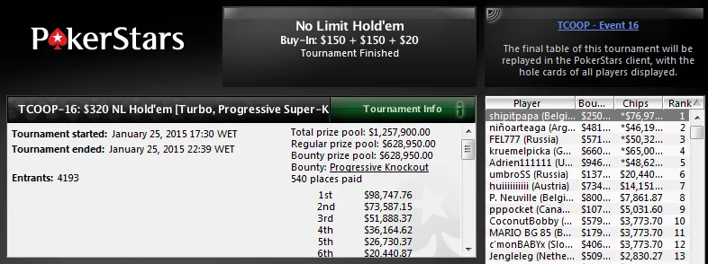 Destaque ainda para a mesa final de Nelson "Mumtum23" Chain no TCOOP 18: $82 PL Omaha [6-Max, Progressive-Knockout] com 3,199 jogadores. Mais uma vez os jogadores brasileiros voltaram a brilhar numa modalidade não Holdem e Nélson faturou US$3,093 pela sexta colocação. A maior parte desta prêmio veio do bounties acumulados que chegaram aos US$2,129!