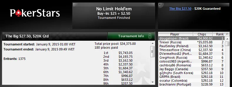 GhRibeiro cravou o $55 Nightly Twenty-Five Grand com 746 participantes. Pela vitória no torneio com US$37,300 de prize pool, o brasuca levou para a sua conta US$6,993!