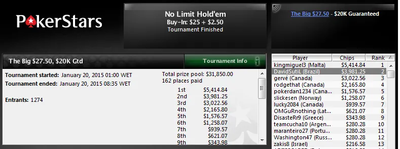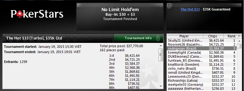 Já fazia tempo que Rodrigo "Terao90" Terão não aparecia nas nossas noticias com um grande resultado nos feltros online. Pois ontem Rodrigo fez por merecer esse destaque. Ele cravou o The Big $162 do PokerStars com 625 jogadores e recebeu US$17,625 de prêmio! Já no fim, venceu o heads-up com "dan82mur" da roménia e levou o maior prêmio dos US$93,750 de prize pool acumulado.