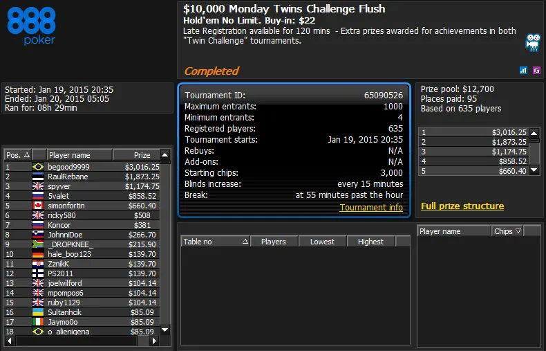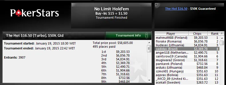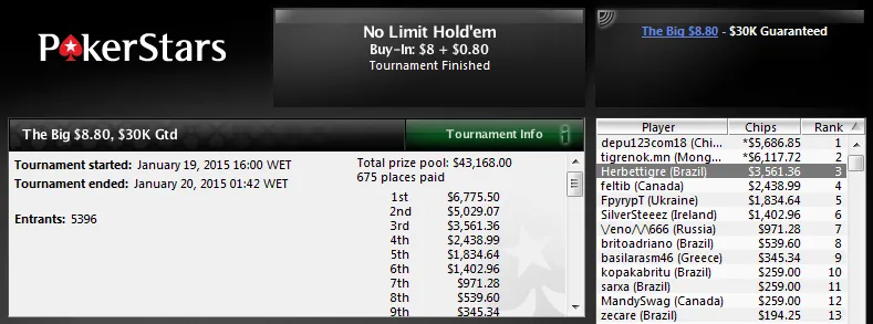 Rodrigo ainda viu o brasuca "084-BO" sair na 3ª colocação para receber US$9,468. Já no inicio da mesa final, "chrisallwin" caiu em 7º e recebeu US$3,046. Torneio recheado hein!