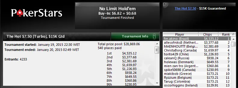 Já no Full Tilt, Pedro "pedrohennn" Correa deu a cravada no Tyrannosaurus Rex com 121 entradas e prize pool de US$18,150. O craque venceu "Bloggerhead" da Republica Checa no heads-up e foi recompensado com US$5,445 de prêmio!