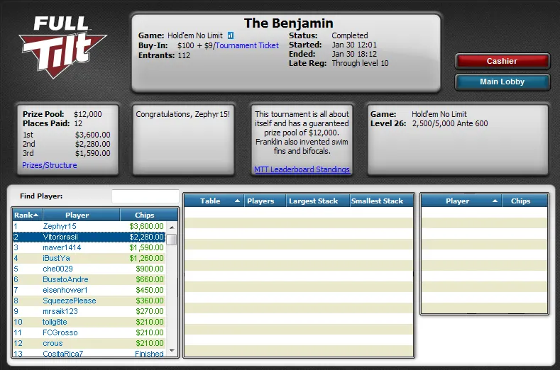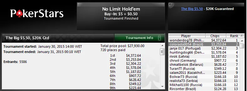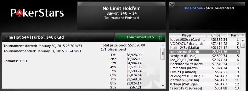 Em noite de forras modestas no poker online, quem se deu bem foi "thaleskoppe" que recebeu US$15,721 depois de dividir a premiação com "AsjBaaaf". O brasuca ficou na segunda colocação do The Big $162 com 650 jogadores e prize pool de US$97,500. Os dois jogadores fizeram acordo no heads-up em racharam ao meio a premiação.