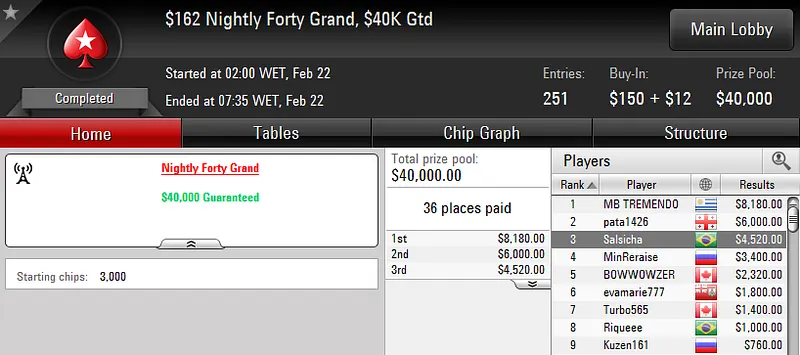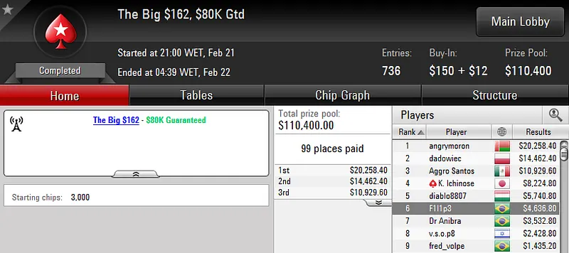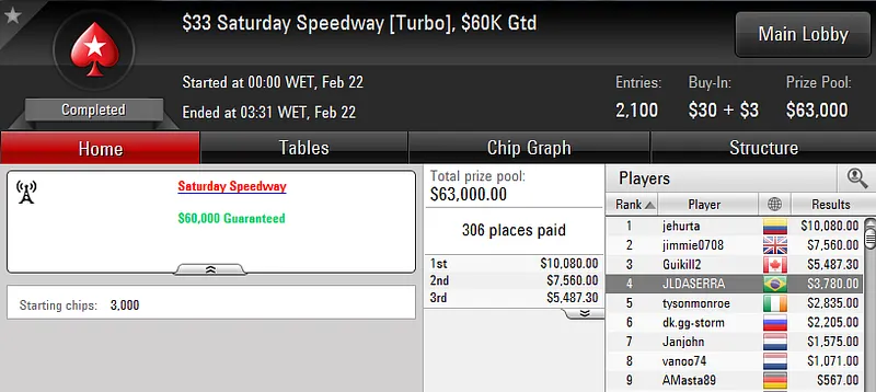 Quem também se deu bem ontem foi o nosso conhecido Andrey "Andreyluis" Luis que conquistou US$6,490 no torneio especial de sábado, o $215 Weekly 6-Max que contou com 427 participantes. O jogador verde e amarelo não chegou ao pódio e saiu na quarta colocação que lhe valeu uma boa fatia dos US$85,400 de prize pool acumulado.