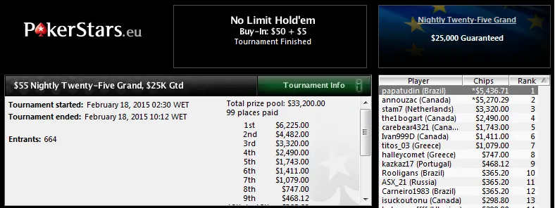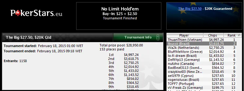 Já o The Big $22 contou com 3,209 jogadores e tivemos "diegoeugenio" na terceira posição do pôdio. O jogador brasuca chegou a acordo com os outros dois finalistas e forrou US$7,042 de prêmio. Logo na quarta colocação tivemos ainda a presença de "Ricardo Buss" que levou US$3,690!