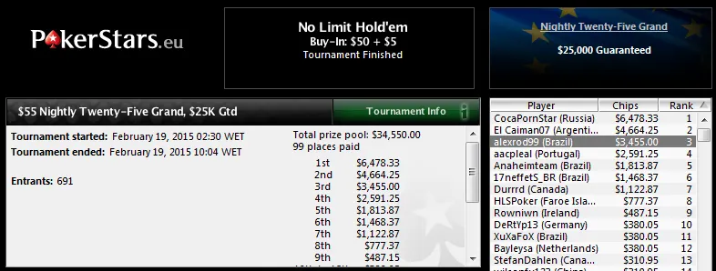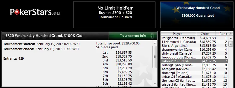 Já "AAdemir" ficou no bronze no The Big $11 que teve um field gigante de 6,970 participantes e prize pool de US$69,700. Pela subida ao pódio recebeu US$5,576 de prêmio e viu "fAisk4" e "alin1923gr" disputarem o heads-up.