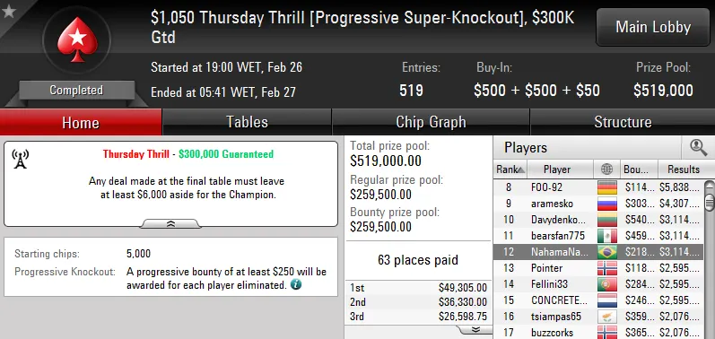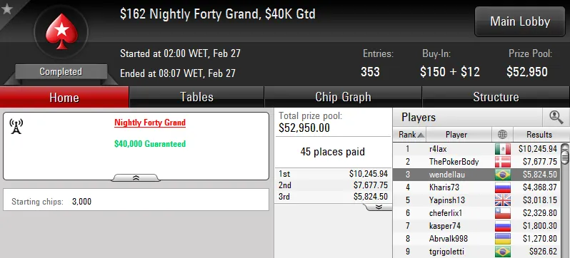 O profissional ainda passou pelo Full Tilt onde cravou o The Benjamin com 171 entradas, juntando assim mais US$4,247 à sua conta!