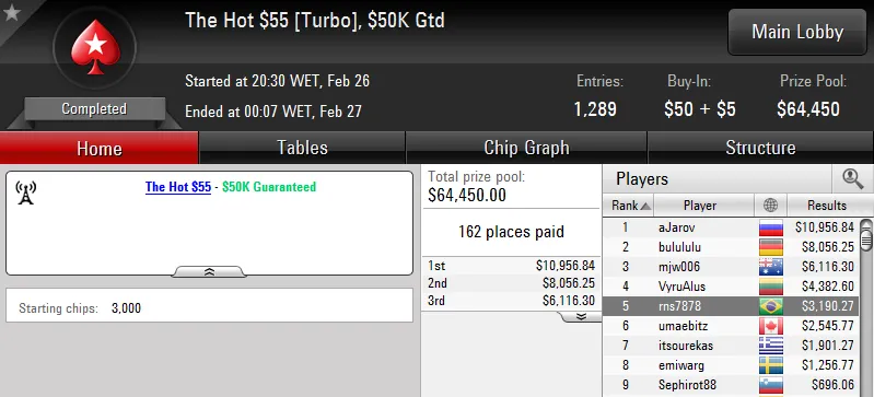 Ainda ontem Cassio "cassiopak" Kiles tinha trazido um bom resultado nos panos dos PokerStars, hoje aproveitou a embalagem e trouxe uma bela cravada no The Big $55 com 1,918 jogadores. O craque brasuca venceu uma fera do poker mundial no heads-up. O espanhol ex-Team PokerStars Online Vicente "vicenfish" Delgado não teve argumentos para Cássio que arrecadou US$15,344 de premiação!