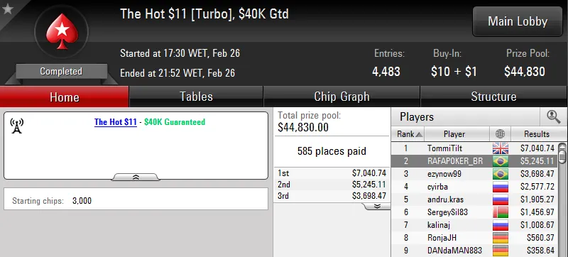 Já o nosso "papa-satélites" João "IneedMAssari" Simão andou bem perto de conquistar mais uns pacotes para os torneios europeus mas foi no The Big $11 que acabou por brilhar. Os 6,756 participantes não tiveram chances contra o craque que acabou levando a maior parcela dos US$67,560 de prize pool. No heads-up, ele derrotou o canadense "WalmartCNXN" para ficar com US$10,475 de prêmio!