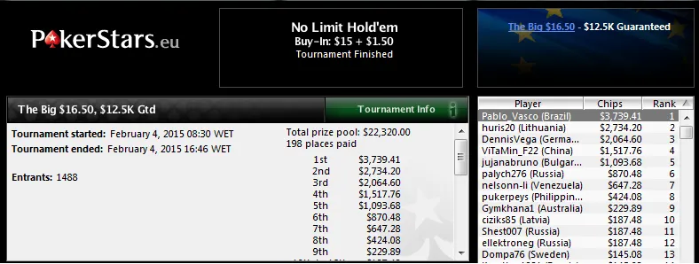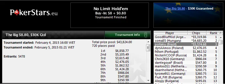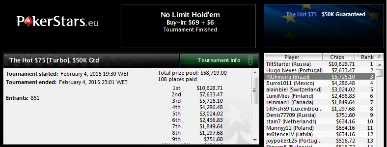 Noutro torneio turbo, o The Hot $11 também assistiu a uma cravada brazuca. "Rodperez" superou a concorrência de 4,673 jogadores para levar o melhor prêmio para casa, foram US$7,340 a cair na conta. Na mesa final deste torenio esteve ainda "brubranco" que recebeu US$2,687 pela quarta posição.
