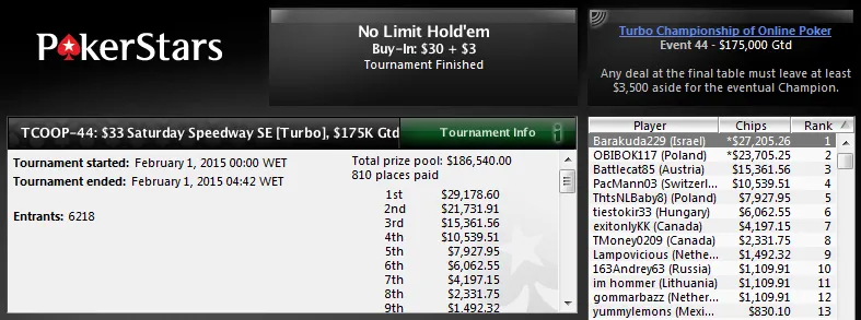 | 50 | $215.00 | TCOOP-50: $215 Sunday Supersonic TCOOP Wrap-Up [Hyper-Turbo], $500K Gtd | 01 Feb | 18:30 | $500,000* | 0 |