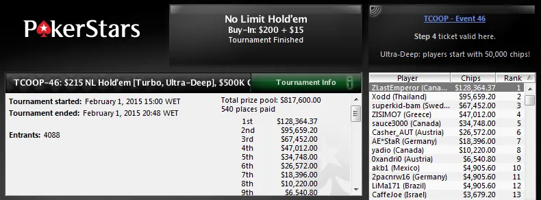 Guilherme "guimoura" Moura também fez bonito nesta competição. No TCOOP 45: NL Holdem [Turbo] com 2,509 jogadores, foi eliminado bem perto do pôdio e arrecadou US$21,616 pela quarta colocação. O prize pool deste torneio chegou aos US$250,900 e o nosso craque conquistou este prêmio depois de fazer deal com os outros 3 finalistas.
