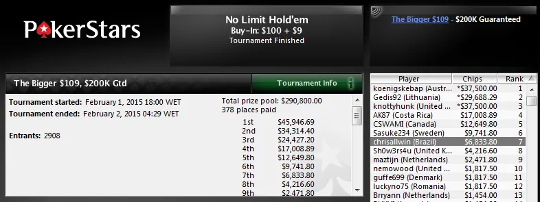 No $109 Sunday Kickoff tivemos a cravada de Flávio "flavioreis88" Reis que entre os 1,749 participantes levou o melhor prêmio, US$27,984! Ainda na mesa final esteve Zilkar "vonBaranow" Baranow que levou US$6,471 pela sexta colocação.