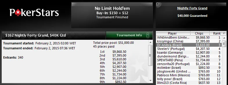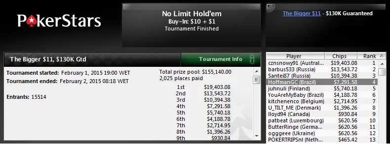 Logo no topo da lista das forras está Rafael "GM_VALTER" Moraes que terminou o $109+R Sunday Rebuy com 961 paticipantes e US$288,400 de prize pool na segunda colocação. O nosso craque dos panos virtuais recebeu "só" US$38,934 de prêmio depois de perder o heads up para "CrownUpGuy" da Áustria.