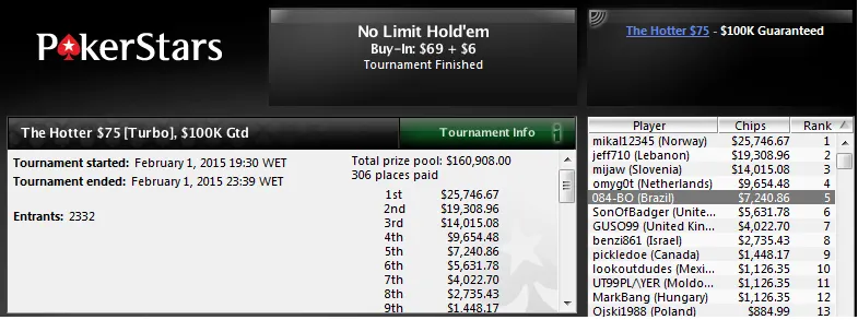 O profissional Thiago "KKremate" Crema foi vice no The Hotter $55 com 3,025 jogadores e recebeu US$17,771 de prêmio! O prize poool deste torneio chegou aos US$151,250 e o craque apenas perdeu no heads-up para o canadense "ulan2009".