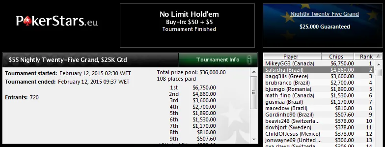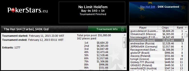 "marrukin" também passou a barreira dos 5 dígitos ao terminar dois torneios na segunda colocação. No The Hot $55 com 1,247 participantes, o jogador brasuca recebeu US$7,793 depois de perder i heads-up para "Jodla111" da Polónia. Antes, no $54 NL Holdem [Turbo, Knockout] com 545 jogadores, já tinha ficado na mesma posição e encaixado US$3,052 de prêmio!