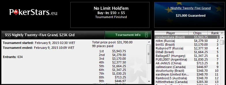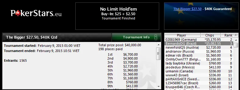 O The Bigger $22 com 7,898 participantes também viu uma cravada brasuca. "ZingaBoy" aprontou nos feltros deste torneio gigante e trouxe para a sua conta US$24,030! O britanico "RLOG" não teve argumentos para o jogador brasileiro no heads-up.