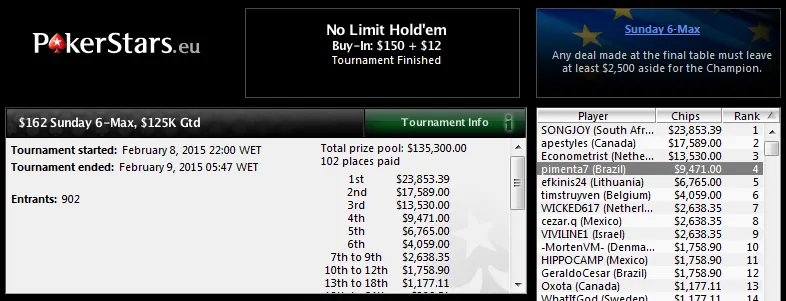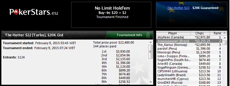 Ainda com uma forra acima dos US$20,000 saiu "trynyth" no The Hotter $75 com 2,334 jogadores. O jogador brasuca mesmo ficando em sengod lugar acabou levando a melhor premiação depois de fazer deal no 3-handed. Foram US$20,387 direitinhos para o caixa! Fora do deal ficou Adrovan "AadrovanRj21" Rodrigues que terminou na quarta posição e recebeu US$9,662 de prêmio.