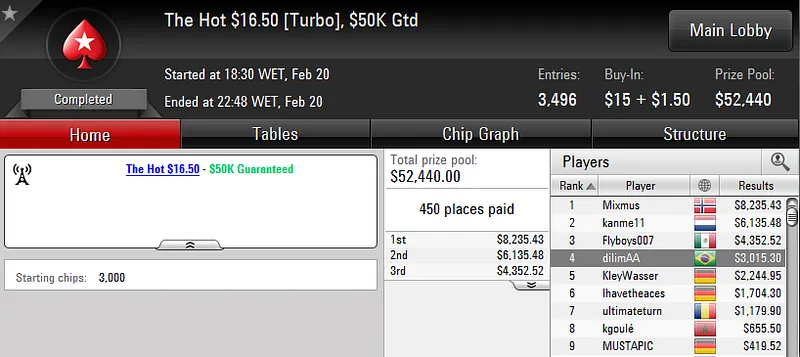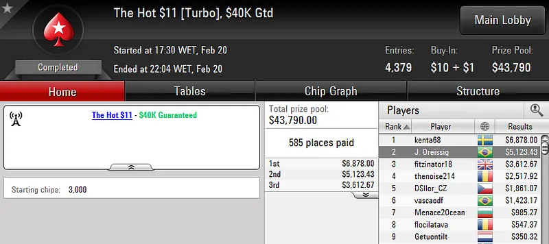 Já "SancaRj" foi vice no The Hot $44 com 1,162 jogadores e encaixou US$5,810 de premiação. O jogador brasuca apenas perdeu no heads-up para "dass" da Suécia trazendo assim a medalha de prata no torneio em que o prize pool chegou aos US$48,480.