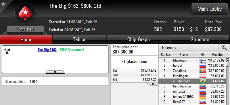 Quem também se deu bem nos regulares do PokerStars foi "angelomagno" que trouxe a medalha de prata no The Big $22 com 3,082 participantes. O prize pool do torneio chegou aos US$61,640 e "angelomagno" só perdeu no heads-up para "gipsi_rumba". Mesmo assim trouxe o maior prêmio, US$8,119 depois de fazer deal no 3-handed.