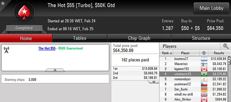 O maior torneio garantido de ontem do PokerStars foi o Super Tuesday que tem o buy in de US$1,050. Victor "Ta Tudo Teso?" Talamini participou neste torneio e arrecadou uma terceira colocação entre os 591 jogadores. Esta já é a segunda vez que Victor consegue este feito e desta vez recebeu US$60,282 de prêmio! Tivemos ainda outra participação brasuca de destaque, "Heartthrob10" bolhou a mesa final e levou "apenas" US$7,092!
