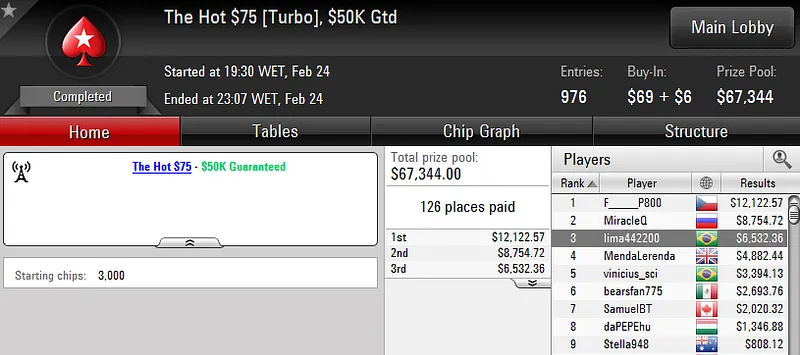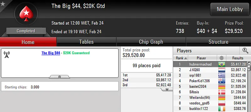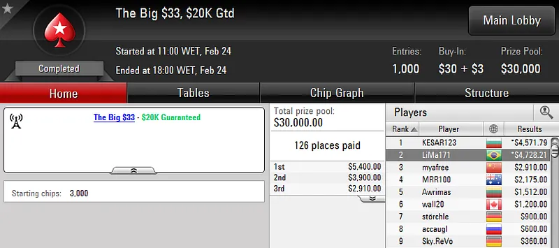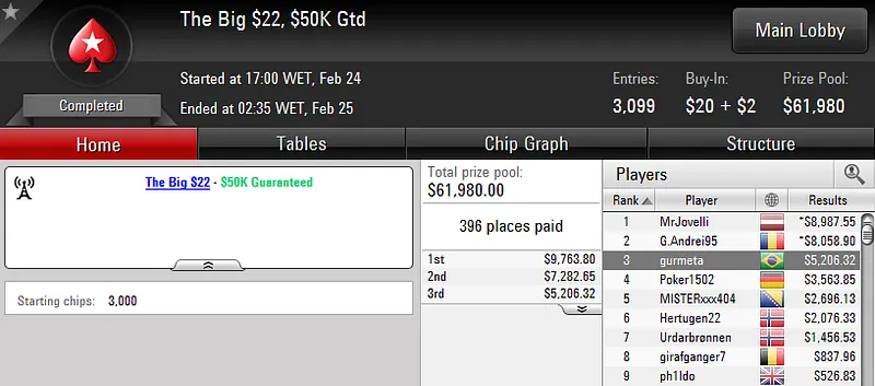 Também na terceira colocação saiu "bbburgues" no The Big $109 com 1,229 jogadores. O jogador brasuca faturou US$11,663 e viu os dois finalistas fazerem acordo no heads-up. Em jogo estiveram US$122,900 de prize pool.