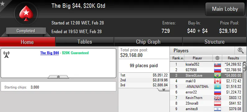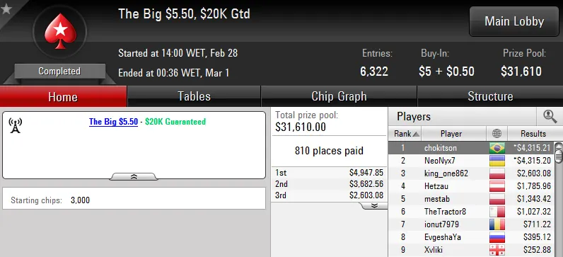 Já a medalha de prata no The Big $22 com 3,603 jogadores rendeu US$8,431 de prêmio a "Mistake45". O jogador verde e amarelo só cometeu erros no heads-up com o português "jorginho88" e ficou com o segundo maior prêmio do torneio.