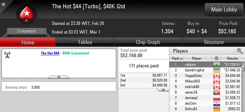 Ainda na marca dos US$8,000 tivemos "NahamaNapoli" que cravou o $162 Nightly Forty Grand com 263 jogadores já no fim desta reta. Ele esmagou a concorrência e viu Marco "marcot" Teixeira levar o bronze e US$4,520 pelo terceiro lugar.