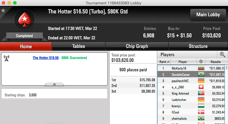 O maior prémio foi de $61,000 e foi ganho por jason13-2008, vice no Sunday Warm-Up.