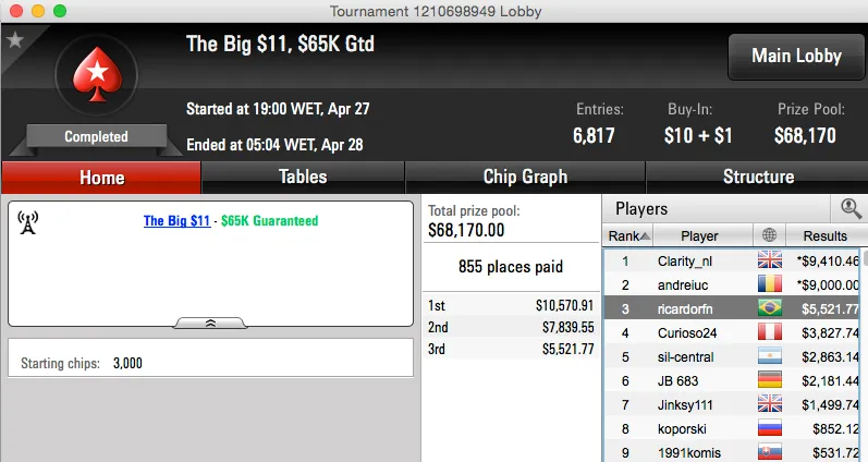A reta de segunda-feira foi bem interessante para as cores brasileiras, cravadas e pódios para todos os gostos. O maior prémio foi o bronze alcançado por ezilagel420 no The Big $109 do PokerStars ($9,292). No mesmo torneio o brasileiro Nandinhojah foi oitavo ($1,916).