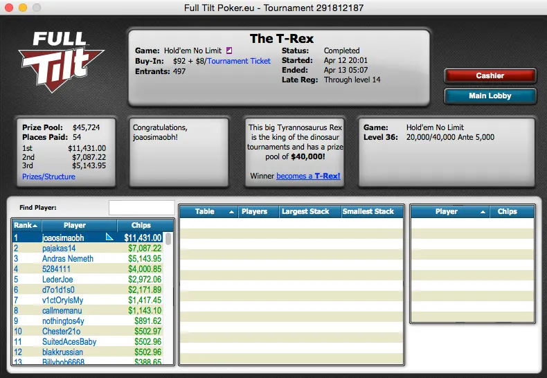 Voltando a João, a vitória seguinte foi a maior da noite e foi alcançada no The Sunday Major. Sem deal Simão cravou o torneio e puxou uma bela nota, $43,897. Pouco mais de meia hora depois chegava a cravada no The T-Rex e caiam mais $11,431 na sua conta.
