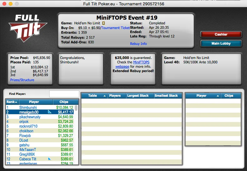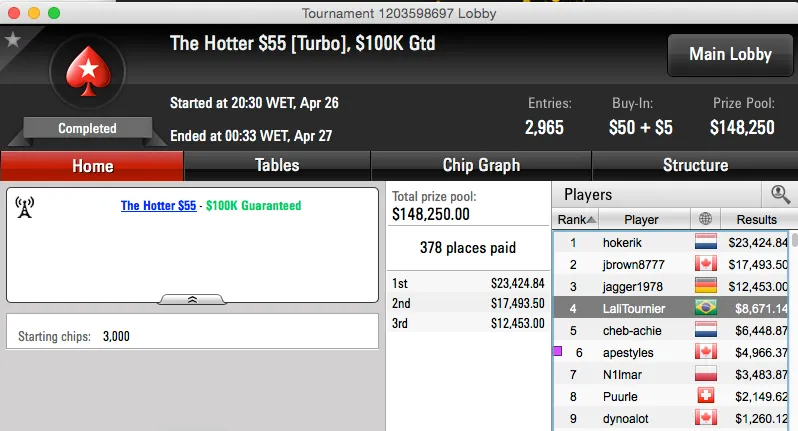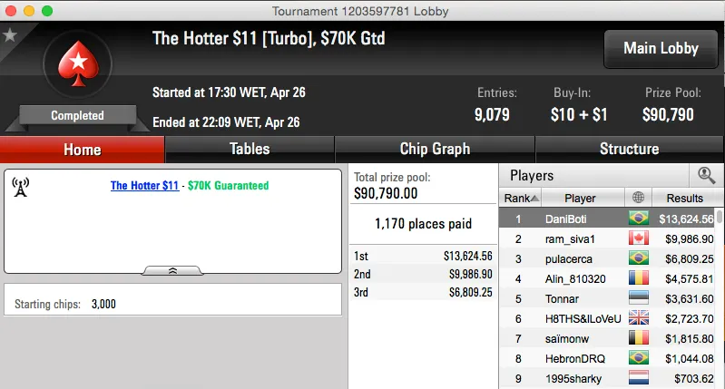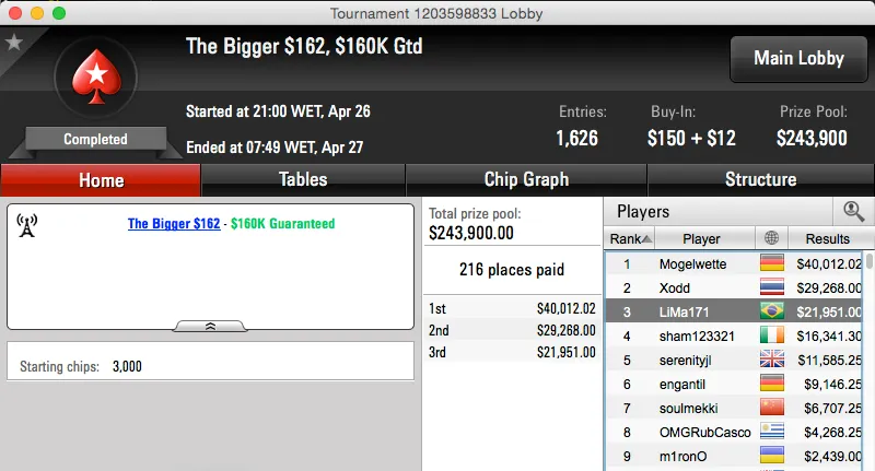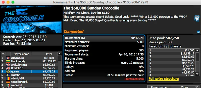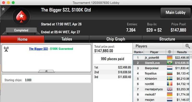 O segundo maior resultado do dia chegou pela mão de um jogador que já nos acostumou com grandes feitos nos feltros virtuais. Yuri "NerdGuy" Martins cravou o Sunday 2nd Chance do PokerStars e sua conta amanheceu com mais $40,187 após acordo heads-up.
