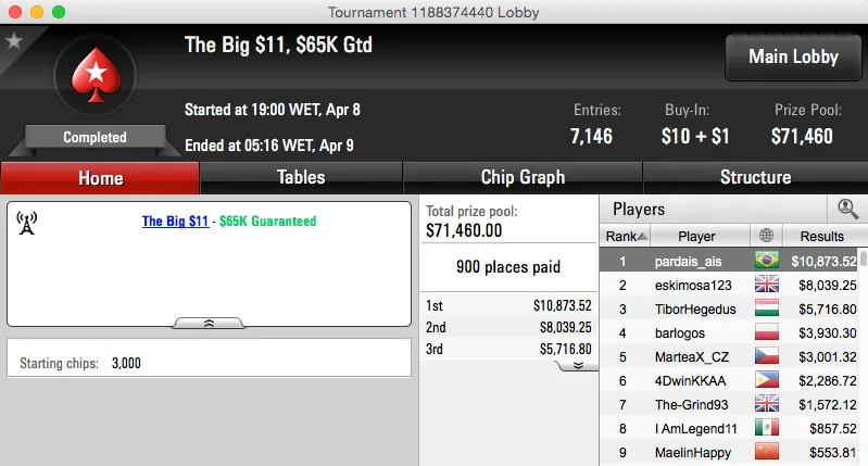 O segundo maior resultado foi uma cravada, chegou no Big $11 pela mão de pardais_ais. Sem acordo, pardais tem agora mais $10,873 na sua conta do PokerStars.