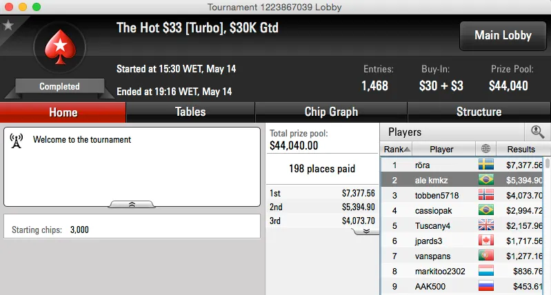 O segundo maior prémio da noite foi a cravada de Israel Lopes no The Big $22, sem deal, Israel tem mais $12,772 na sua conta do PokerStars.