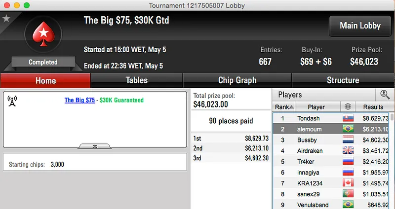 O segundo maior resultado chegou pela mão de "rickslz17" no The Big $162 do PokerStars. O brasileiro ficou chegou a acordo heads-up e terminou o segundo lugar ($15,768).