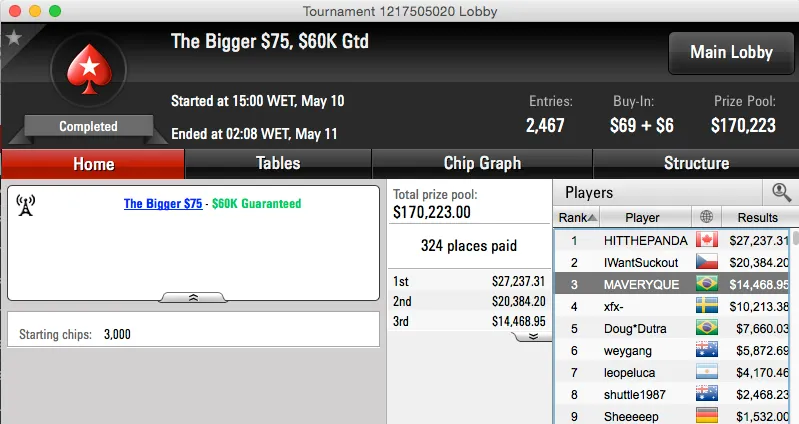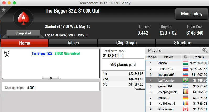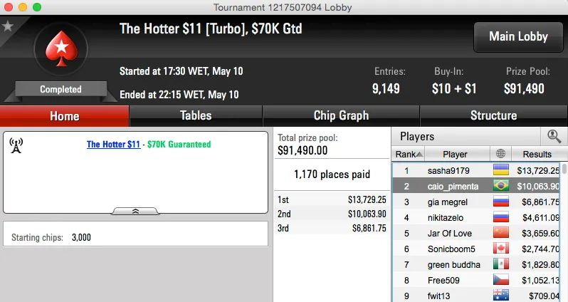 A reta de ontem foi mais uma vez bem recheada para os cofres do Brasil, o maior resultado chegou pela mão de Caio Hey. Caio foi o segundo classificado do The Bigger $109 do PokerStars e após chegar a acordo heads-up levou $43,809.