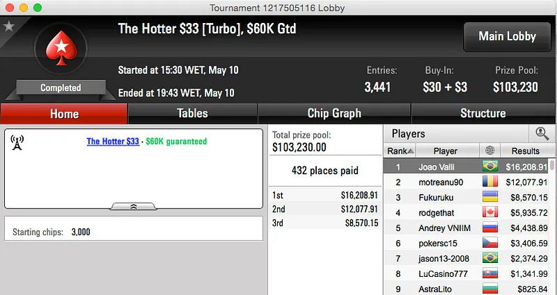 O pódio fecha com um jogador tem sua conta "pegando fogo", Bernardo Dias, foi terceiro no $215 Sunday Supersonic e tem mais $35,536 na sua conta do PokerStars. Veja abaixo a outra mesa final que Bernardo alcançou ($17k).