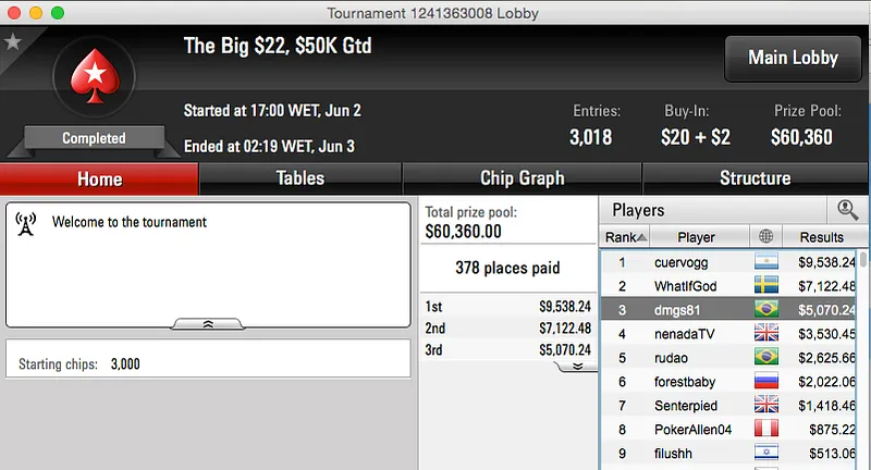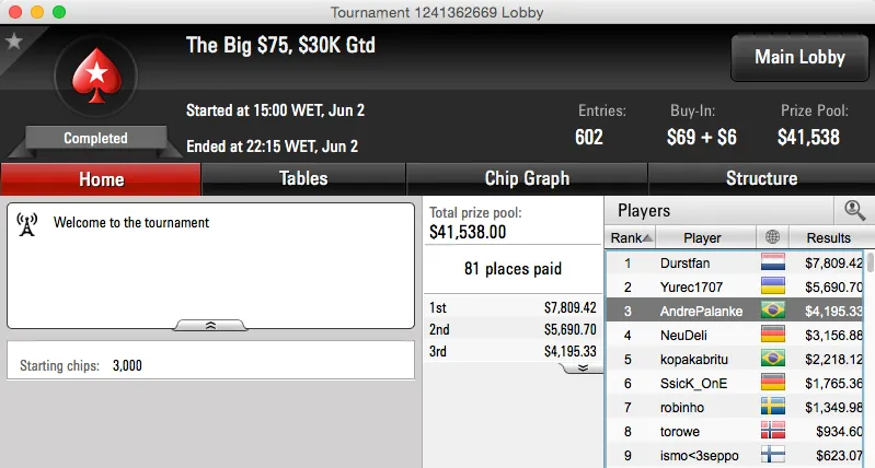 O segundo maior prémio do dia de ontem foi alcançado por dudu2508 no The Big $55, também no PokerStars. O bronze rendeu $8,406.
