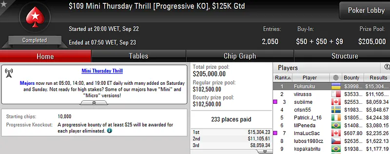 O grande vencedor da noite foi "BundAA" que conquistou o Bounty Builder $109 com 1,544 jogadores e US$154,400 de prize pool acumulado. A vitória não só deu direito à medalha de ouro mas também a US$11,214 de prémio aos quais ainda somou US$4,788 em bounties. Destaque aidna para "boladegude" que chegou à mesa final e recebeu US$2,659+US$221.