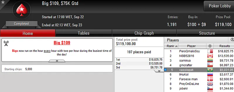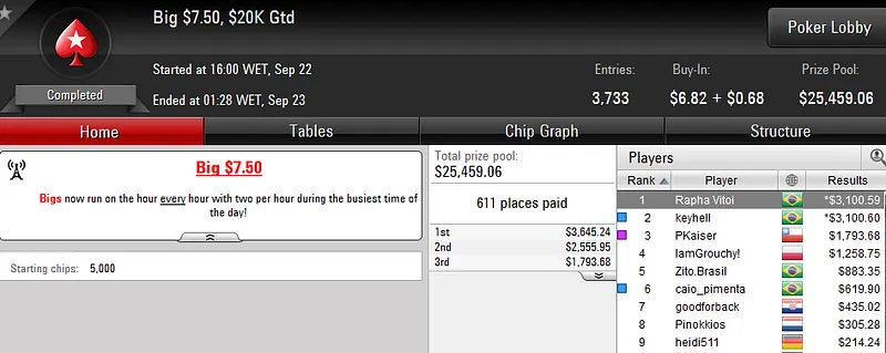 Na terceira colocação terminou "SELOUAN1991" no The Big $215 com 584 jogadores. Pelo excelente participação o jogador brasileiro arrecadou US$10,842, e ainda viu "vitinhonrr15" levar US$7,868 pelo 4º lugar.