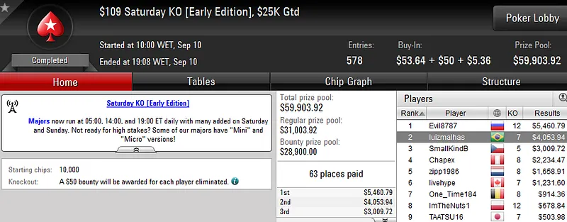 Yago "yhsimplicio" Simplicio também trouxe a prata no Big $55 com 1,586 jogadores. O field gigante não assustou o nosso representante que encheu os cofres com US$8,663. O priemiro prémio foi para o argentino "ramastar88".