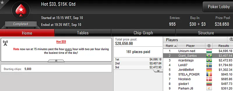 Mais uma medalha de prata veio no Hot $109 com 788 jogadores. Desta vez foi "dantegoyaF" que perdeu no heads-up para "FireFaux". A 2ª colocação valeu US$9,715 de prémio.
