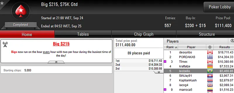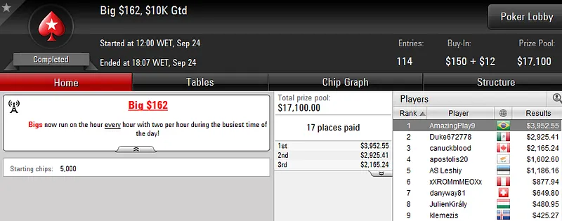 "Timunim" foi o grande vencedor da noite a cravar o Big $109 com 1,027 jogadores e US$109,700 de prize pool. O jogador verde e amarelo deu show e venceu o austríaco "bloczek60" no heads-up. Não sei antes fazer a divisão dos prémios que lhe valeu US$14,524.