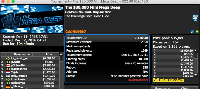 Cheveau acabou sendo eliminado em quinto lugar e recebeu $34.521,40. Para além de Cheveau, houve mais brasileiros na mesa final. Heartthrob10 foi bronze e puxou $70,097.