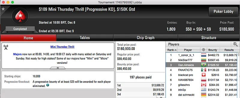 O segundo maior resultado da reta foi também proveniente de uma cravada, no Bounty Builder $109. Catukinho foi o melhor e juntou mais $13.915 ao seu bankroll.